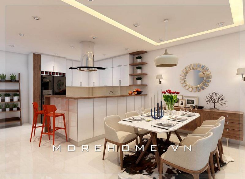 Liền kề là phòng khách sang trọng là không gian phòng ăn ấm cúng kết hợp phòng bếp giúp cơi nới không gian thêm rộng hơn, giúp cho cả gia đình luôn có cảm giác ấm áp quây quần bên nhau