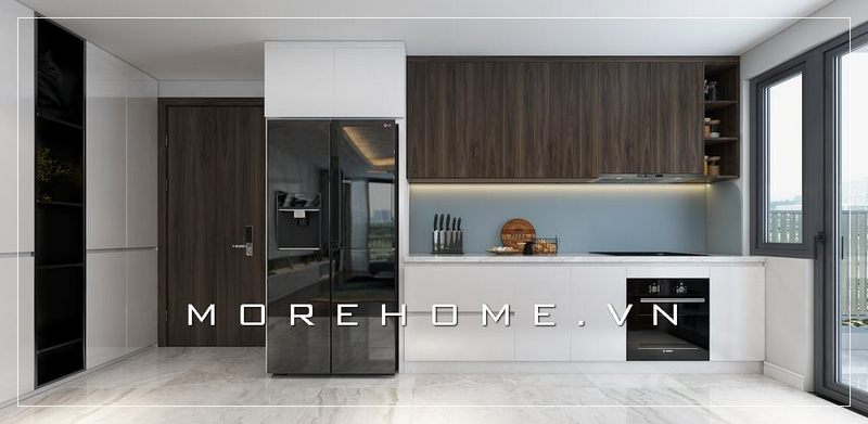 Tủ bếp chữ i với thiết kế hiện đại, đơn giản kết hợp chất liệu, màu sắc tương phản mang lại cảm giác căn hộ rộng hơn thực tế.