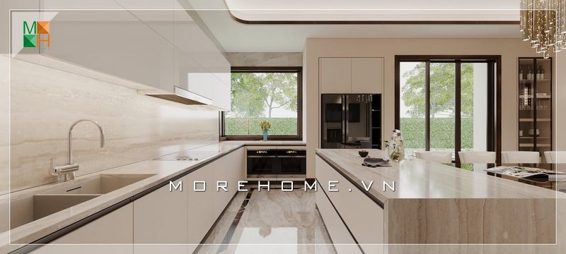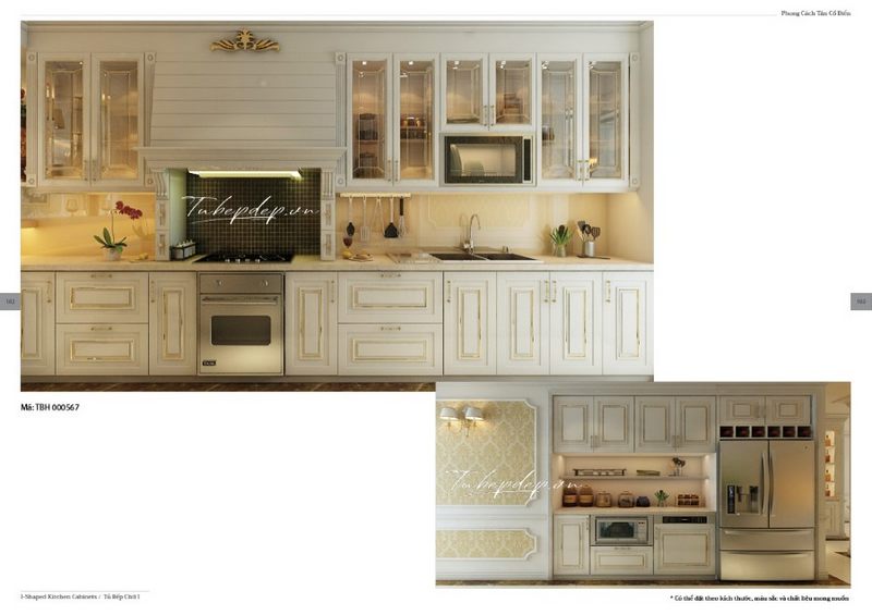 MoreHome tư vấn sử dụng mẫu tủ bếp tân cổ điển kiểu chữ i gọn gàng cho không gian bếp tiện nghi, cao cấp