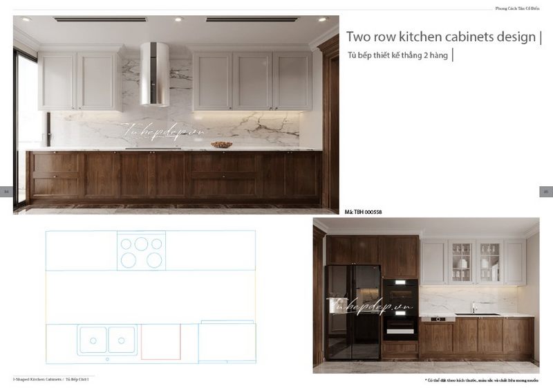 Tủ bếp gỗ công nghiệp kiểu dáng chữ i nhỏ gọn được đặt song song với nhau phù hợp với không gian nhà bếp nhỏ cũng như tạo thuận tiện hơn cho người nấu nướng di chuyển