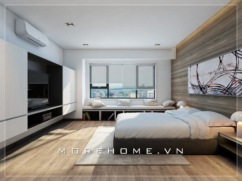 Thiết kế nội thất phòng ngủ chung cư hiện đại, KTS lựa chọn gam màu trung tính nhẹ nhàng giúp cho chủ nhân căn phòng cảm giác thoải mái và dễ chịu hơn