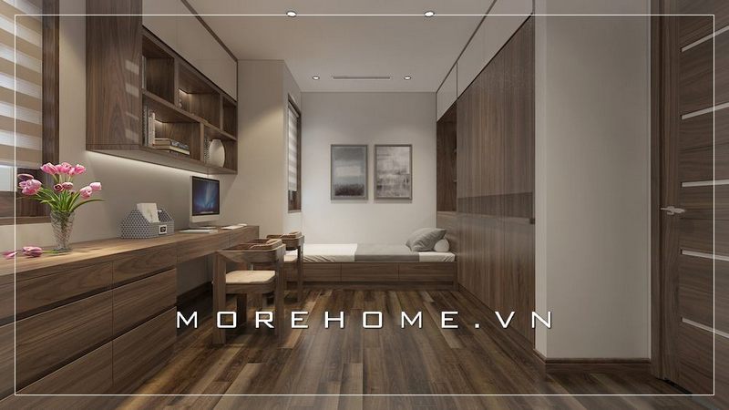 Nội thất phòng ngủ chung cư hiện đại, bàn học nối liền tap đầu giường cùng tone màu tạo nên sự liền mạch cho cả không gian phòng ngủ