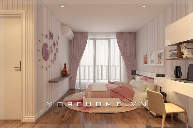 Mẫu thiết kế nội thất phòng ngủ cao cấp với cách bố trí nội thất một cách hợp lí, khoa học mang đến sự nhẹ nhàng, dễ thương với tone màu hồng cho phòng ngủ của bé gái
