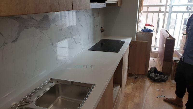 Đá ốp mặt bếp đá nhân tạo màu trắng với ưu điểm vượt trội không vết nối bề mặt bằng phẳng thẩm mỹ mang lại cao dễ dàng vệ sinh tiết kiệm thời gian cho người nội trợ hằng ngày