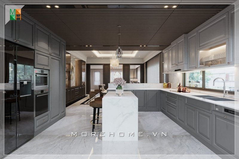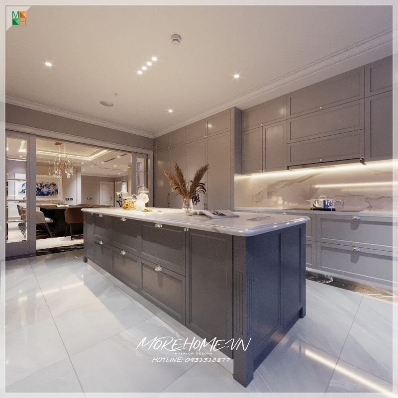 Hệ thống tủ bếp kèm bàn đảo bếp bằng gỗ tự nhiên sơn tông màu ghi kết hợp mặt đá nhân tạo màu trắng vân mây sang trọng