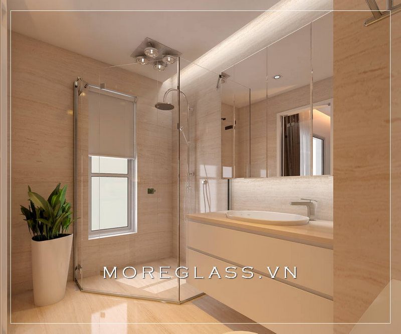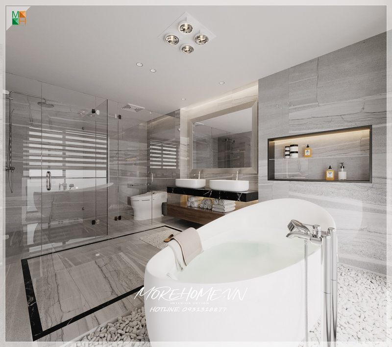 Phòng tắm hiện đại được thiết kế với những kệ tủ trang trí, tủ lavabo đơn giản nhưng hiện đại, cùng với các thiết bị vệ sinh và phòng tắm kính đẹp.