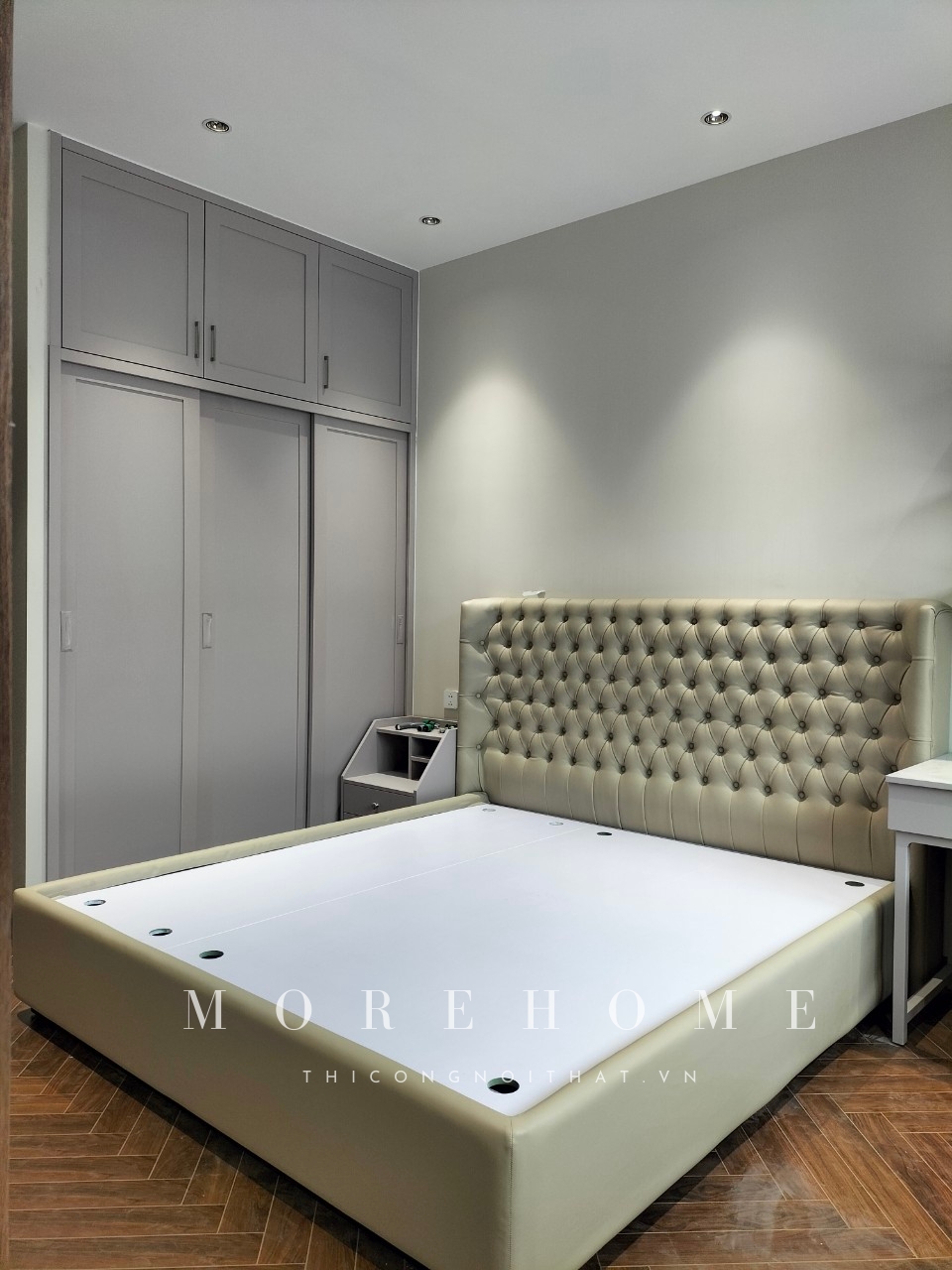 Giường hiện đại được thiết kế để phù hợp với không gian chung cư cao cấp. Nó được làm bằng khung gỗ dán kết hợp với xương gỗ tự nhiên để tạo thành hình dáng đẹp. Đệm mút Latex nhập khẩu từ Nhật Bản được bọc bởi nỉ giả da Hàn Quốc.
