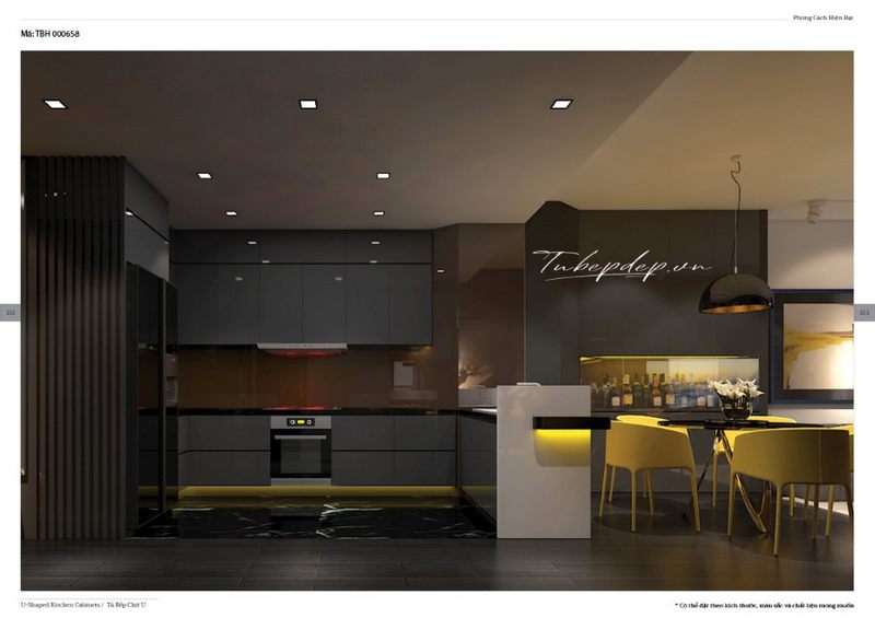 Tủ bếp acrylic màu xám - bàn ăn có phong cách hiện đại trẻ trung được nhấn mạnh trong thiết kế phòng bếp của biệt thự, nhà phố, chung cư cao cấp, gây ấn tượng mạnh mẽ.