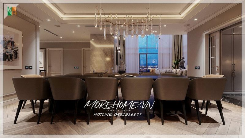 Phòng ăn có diện tích rộng thể, một bộ bàn ăn 14 ghế sẽ là lựa chọn hợp lý để chuẩn bị những bữa cơm gia đình.