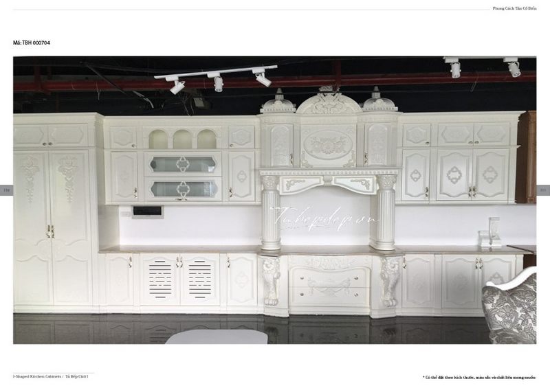 Tủ bếp tân cổ điển màu trắng với thiết kế hình khối có phong cách cổ điển sẽ làm cho không gian bếp trở nên sang trọng như những nhà cổ.