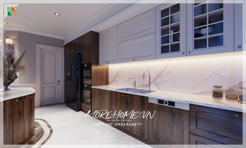 . Tủ bếp và tủ bếp đảo hiện đại có một bề mặt được ốp đá nhân tạo cao cấp màu đen, giúp tăng cường sự sang trọng và tiện nghi trong quá trình nấu nướng. Điều này cũng giúp cho việc dọn dẹp và vệ sinh dễ dàng hơn.